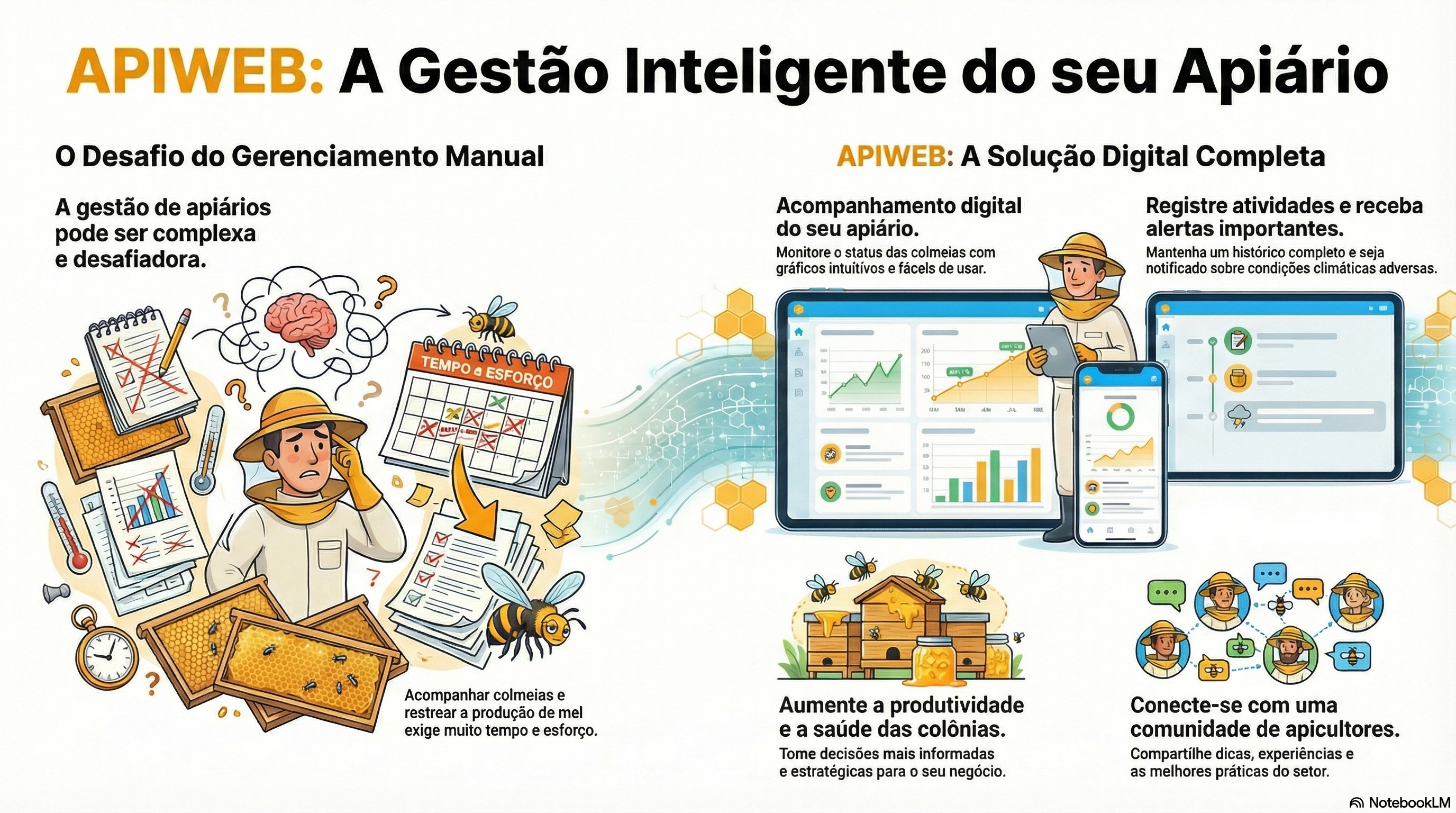 Além disso, o APIWEB também conecta você com outros apicultores, promovendo troca de experiências e fortalecendo a apicultura.